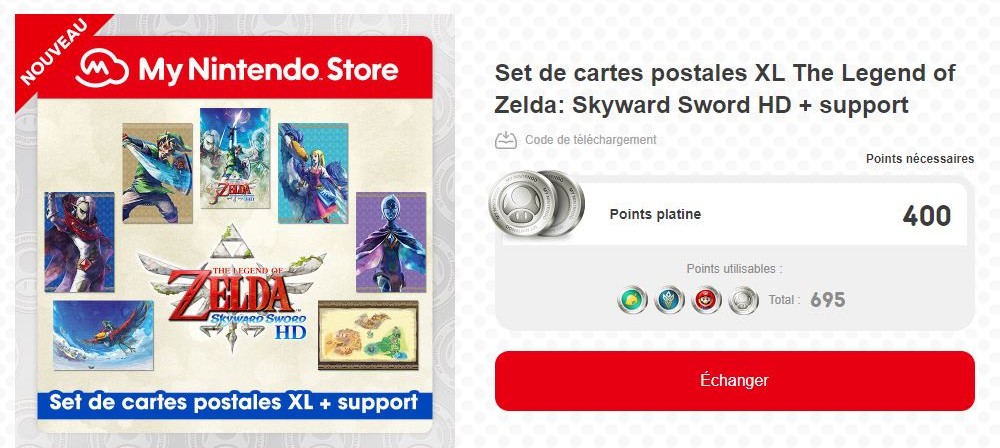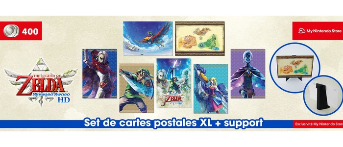 Pour célébrer la sortie de The Legend of Zelda: Skyward Sword HD sur Nintendo Switch, Nintendo "offre" via son service de fidélisation My Nintendo, un set de cartes postales géantes que vous pouvez exposer chez vous grâce à un petit support en carton fourni. Le set est "gratuit" ou presque puisqu'il vous faut l'échanger contre 400 points platine que l'on collecte simplement en jouant ou en se rendant sur l'eShop et le site de Nintendo. Par ailleurs, il faut s'acquitter aussi des frais de port, fixés en France métropolitaine à 6,99€. Notez que les frais de port ne bougent pas, si vous en profiter pour commander un article sur le store de My Nintendo. Pour voir à quoi ressemble ce set de cartes géantes, retrouvez son descriptif et quelques images sur cette page.
