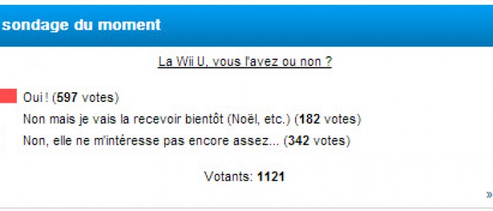Pour le dernier sondage, nous faisions un petit état des lieux sur les membres de Nintendo-Master qui ont déjà craqué pour la Nintendo Wii U. Les résultats sont sans appel puisque la grande majorité d’entre vous ont déjà la petite dernière de BigN ou s’apprêtent à la recevoir. Sur les 1 121 membres qui ont bien voulu répondre à notre sondage, 31% avouent tout de même ne pas être intéressés par la Wii U à l’heure actuelle.