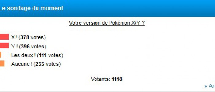 Quant au sondage précédent, à propos du dernier opus de Pokémon sur 3DS, le moins qu'on puisse dire, c'est que les résultats sont serrés : 34% d'entre vous ont opté pour la version X et 35% pour la version Y (une différence de 18 voix sur 1118 !). 10% de Pokémaniacs ont les deux, et 21% de... touristes, aucune des deux.
