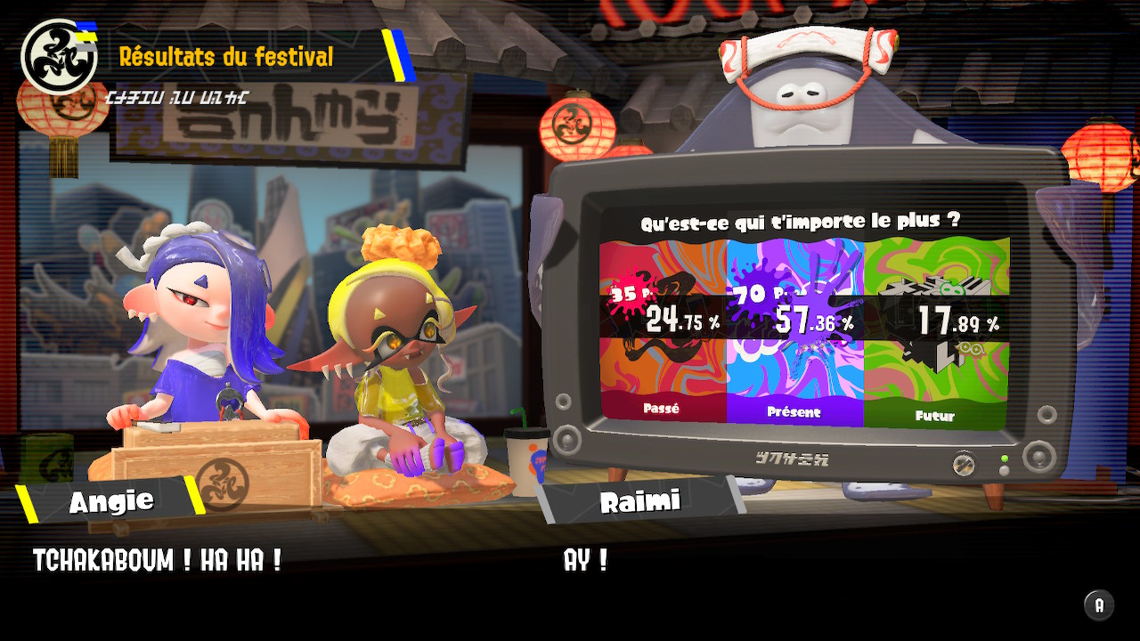 Après plus de deux années de suivi, de mises à jour, d'ajouts d'armes, de cartes, de musiques et de nouvelles saisons, l'aventure Splatoon 3 prend désormais fin avec la clôture de son grand Festival "Qu'est-ce qui vous importe le plus ? Passé, Présent ou Futur ?". Ce grand Festival s'achève donc, après trois jours de festivités consécutifs, par la victoire de l'équipe Passé avec énormément de points d'avance. Félicitations aux gagnants !