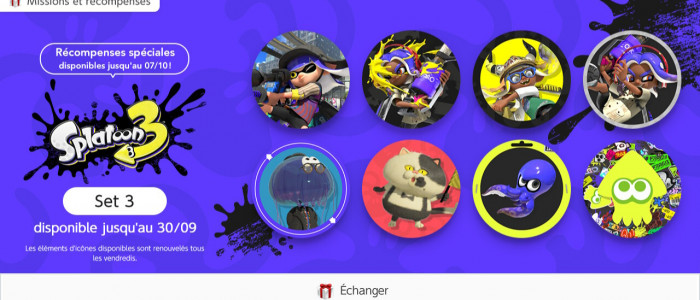 Après une première vague il y a deux semaines (voir notre article en cliquant ici), puis une seconde la semaine dernière (voir notre article en cliquant ici), l'application Nintendo Switch Online vient de déballer sa troisième vague d'éléments d'icônes à personnaliser estampillés Splatoon 3. Comme d'habitude, ces éléments divisés en trois catégories (cadres, personnages et fonds) sont disponibles contre quelques points platine et vous permettront de créer vos propres icônes utilisateurs. Les éléments de cette semaine seront disponibles jusqu'au vendredi 30 septembre à 1 heure du matin.