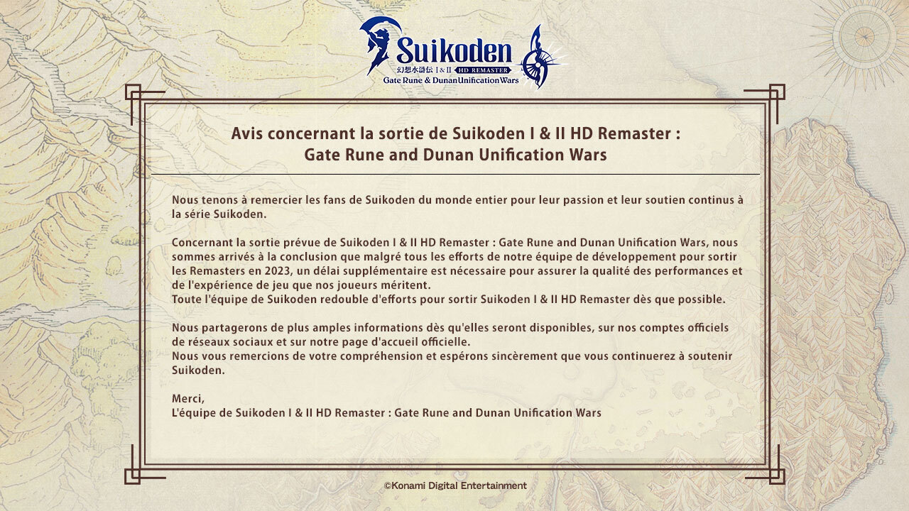 C'est une nouvelle dont on se doutait et qui risque de faire hurler notre JDG national, initialement annoncé pour une sortie courant 2023, Suikoden I & II HD Remaster vient d'être repoussé ce jour à une date indéterminée. C'est Konami qui vient de faire un communiqué officiel, mettant en avant le besoin de l'équipe de développement de peaufiner les détails de ce remaster pour une sortie, on l'espère, en 2024. En attendant de nouvelles informations sur le jeu, nous vous laissons re-découvrir le trailer de présentation de la compilation.