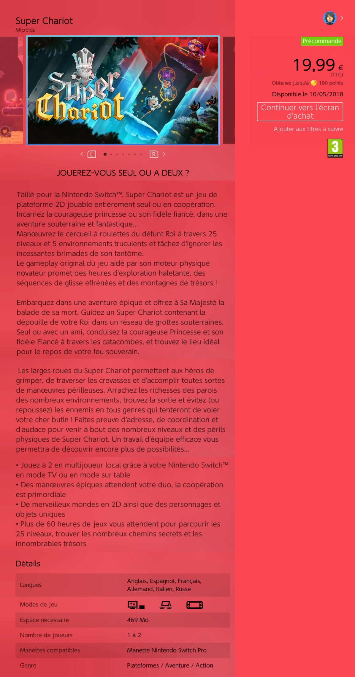 Sorti sur Wii U, Chariot est un jeu de plateforme et d'aventure jouable seul ou à deux en coopération. Il s'apprête à ressortir sur Nintendo Switch dans une version "Super" qui reprendra l'intégralité du titre original agrémenté du DLC,"Royal Gadget". Grace à sa fiche eShop que vous pouvez retrouver ici., on apprend notamment que Super Chariot sortira le 10 mai sur Nintendo Switch au prix de 19,99€ pour un poids de 469 Mo.