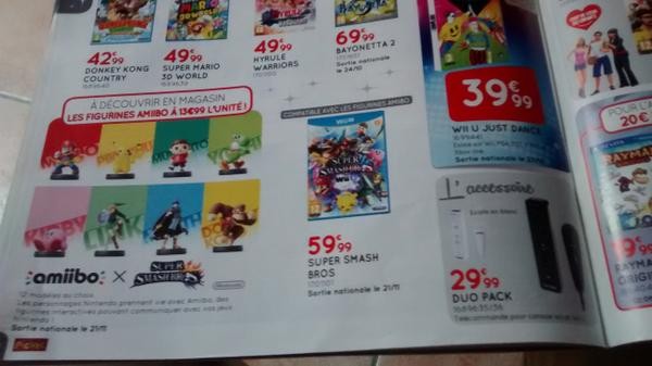 Cela fait maintenant depuis quelques mois que la rumeur à propos de la sortie éventuelle du jeu pour fin novembre revient et cette journée pluvieuse du 7 octobre ne déroge pas à la règle. La rumeur nous vient cette fois-ci d'un internaute qui a posté l'image d'un catalogue annonçant Super Smash Bros. Wii U ainsi que les figurines Amiibo comme étant prévu pour le 21 novembre. Wait & see.