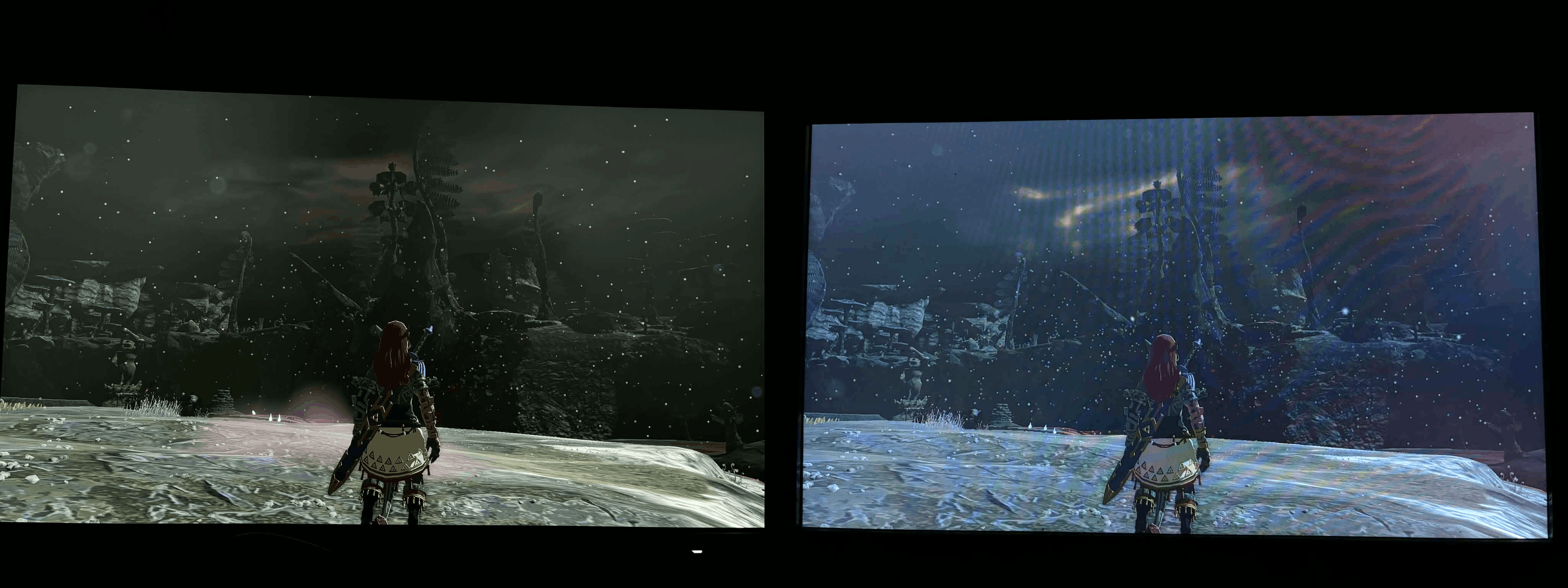 Certaines scènes marquent durablement. Les bateaux pris dans la tempête de l'un des biomes d'Hades II, ou encore les couchers de soleil et les souterrains dans The Legend of Zelda: Tears of the Kingdom, gagnent en profondeur et en crédibilité. Les sources lumineuses ressortent sans écraser les détails environnants. Le HDR n’est pas spectaculaire à chaque instant, mais il affine l’image de manière constante et devient rapidement indispensable. On alterne entre émerveillements devant certains noirs et impressions d'avoir des couleurs délavées et pas assez sombres sur un autre écran.