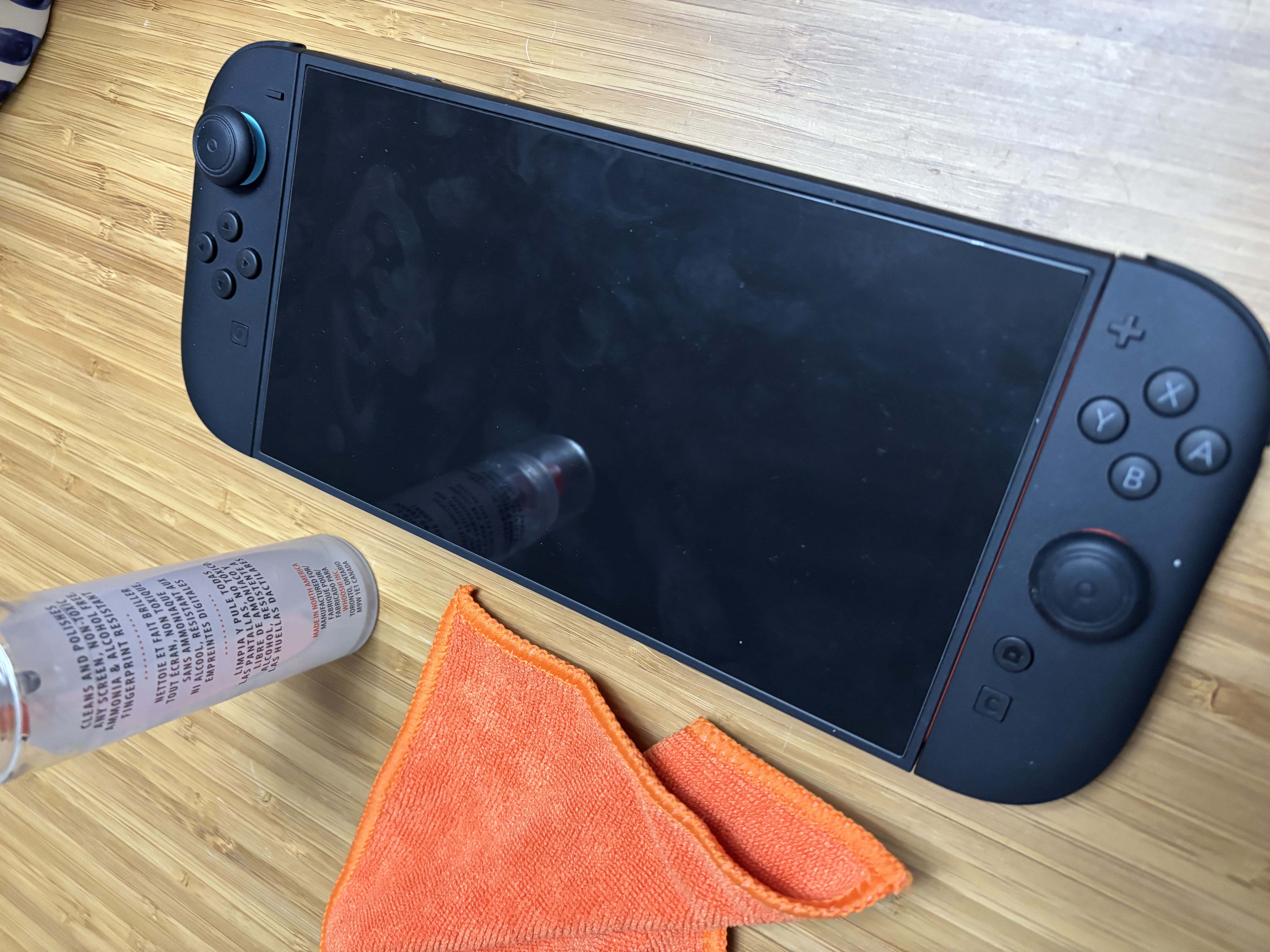 Le vrai point fort de WHOOSH Screen Shine (le nom complet du produit), c’est son efficacité immédiate. Sur ma Nintendo Switch 2, qui est équipée d’un film de protection, le résultat se voit tout de suite, l’écran ressort propre, vraiment propre, sans voile résiduel, sans traces qui réapparaissent dès que j’incline un peu la console ni cette finition moyenne que j’ai souvent fini par tolérer avec des produits plus ordinaires. Le kit fourni par SB Supply contenait une grande bouteille du produit, une plus petite pour l'emporter et deux serviettes en microfibre sur lesquelles il faut vaporiser le produit avant d'essuyer nos écrans avec. J'ai tout fait, mes Nintendo Switch, ma télévision, mon écran, ma tablette, mon téléphone et même mes lunettes avec. Le résultat était tellement impeccable qu'une seconde je me suis cru dans la peau d'un vendeur de téléachat.