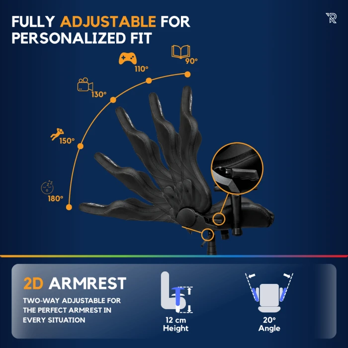 Ranqer n’a pas oublié les petits détails côté confort, avec l’assise inclinable jusqu’à 180° (testé sans se casser la figure, s’il vous plaît !). Comme indiqué plus tôt, le dossier enveloppant épouse la forme de votre dos, et vous avez également des coussins lombaires et cervicaux fournis dans le carton. Deux ouvertures sont situées sur la partie supérieure du dossier pour passer les sangles élastiques à travers et fixer les coussins afin d’éviter qu'ils ne glissent. Avec une capacité de charge allant jusqu’à 150 kg, on reste sur une finition globale et un rapport qualité / prix très intéressants pour les joueurs n’ayant pas forcément de gros budget à mettre dans un fauteuil, mais souhaitant tout de même prendre soin de leur dos. Mon seul petit bémol se fera au niveau des accoudoirs. Ces derniers sont réglables en hauteur, et on peut les ajuster de + ou - 20 degrés, mais on ne peut pas les avancer ou les reculer. Cette fonction peut sembler gadget, mais quand on y a goûté, dur de revenir en arrière.