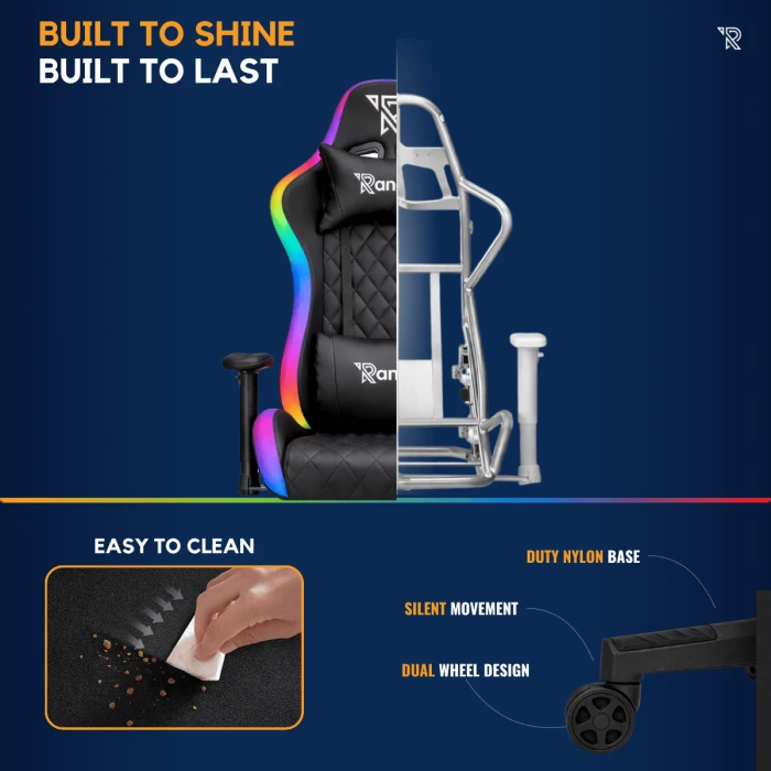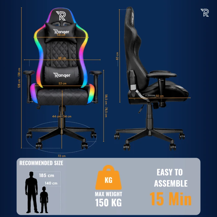 Si l’on est bien sur une structure métallique proposée pour le fauteuil, on retrouve toutefois quelques concessions au niveau des matériaux pour justifier le prix de 150€. La base du piètement qui accueille les roulettes est en deux parties (pour éviter une dimension plus grande du carton sûrement), et les roulettes sont en plastique. Les dimensions de l’assise et du dossier restent quant à elles très correctes pour le tarif proposé. Comptez 54 cm de largeur d’assise, et la même chose pour la largeur du dossier. La Chaise Gamer LED Ranqer Halo propose par ailleurs le fameux dossier enveloppant au niveau des épaules pour un confort d’assise optimal. Les dimensions proposées conviendront parfaitement à des gabarits dits « standards », mais aussi aux gabarits plus forts. Avec mes 183 cm et mes petits 110 kg sur la balance, je conserve un confort d’assise optimal, que ce soit en position bien rigide lorsque je suis sur mon PC pour le travail, ou en position davantage « affalée », avec mes pieds sur ma table basse devant mon téléviseur pour mes sessions gaming.