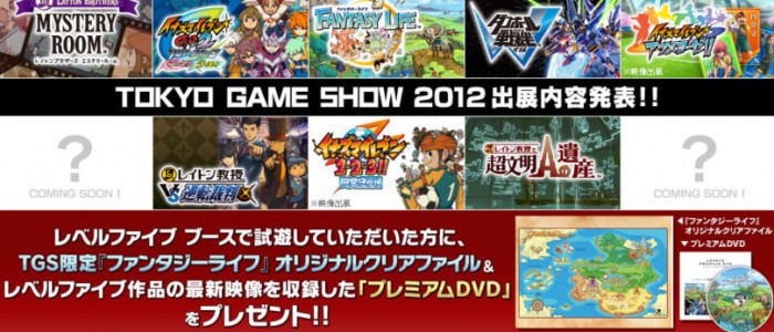 Mercredi dernier, le magazine Famitsu laissait entendre que Level-5 avait quelques surprises à nous dévoiler dans les jours qui arrivent. L’information semble aujourd’hui confirmée via le site officiel du studio qui dévoile son line-up pour le Tokyo Game Show 2012. Concentré sur la Nintendo 3DS, le stand Level-5 accueillera Fantasy Life, le crossover Layton vs. Ace Attorney, la sixième aventure du Professeur dévoilée lors du dernier Nintendo Direct, les prochains Inazuma Eleven ainsi que deux surprises encore non dévoilées à ce jour. Pour l’heure, notre boule de cristal ne nous dit pas si ces surprises concerneront les plates-formes Nintendo mais étant donné les bonnes relations qui règnent entre Level-5 et Nintendo, nous pouvons le croire.