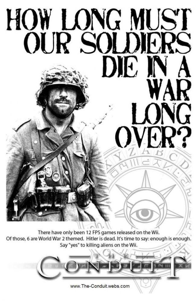 Traduction NM : "Encore combien de temps nos soldats devront mourir dans une guerre qui est finie depuis longtemps ? 12 FPS sont sortis sur Nintendo Wii dont 6 ayant pour thème la deuxième Guerre Mondiale. Hitler est mort. Il est temps de dire : Il y en a assez. Dites oui pour tuer des aliens sur Wii."