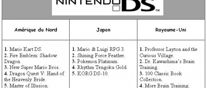 Pour la Nintendo DS, les leaders de chaque pays restent les mêmes que la semaine précédente. Mario et Luigi RPG 3 continu à dominer les ventes au Japon. A noter l'arrivée dans ce top 5 de Puzzle Quest : Galactrix en Amérique du Nord et de celle de Chrono Trigger en France.