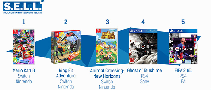 Sans surprise, Nintendo conserve encore sa place de grand leader en ce début d'année (en France du moins) avec pas moins de 3 jeux sur le podium. En l'occurrence, Mario Kart 8 Deluxe qui est sans conteste LE jeu de la Nintendo Switch qui se place à la première place cette semaine, suivi de Ring Fit Adventure et Animal Crossing : New Horizons. La fin de ce top se conclut avec deux jeux provenant de Sony avec Ghost of Tsushima en quatrième position ainsi que FIFA 21 à la cinquième place. En comparatif à la semaine dernière, le classement reste quasiment inchangé. Mais alors qui détrônera Big N cette année ?