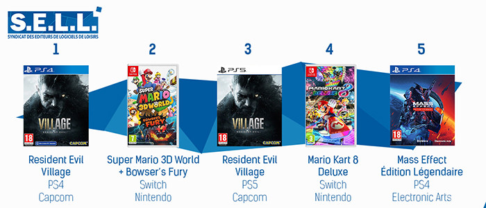 Installé depuis la semaine dernière dans le top, les zombies de Resident Evil Village maintiennent leur position en se plaçant en 1ère et 3ème position pour les versions PS4 et PS5. Nintendo de son côté sauve la mise avec deux titres phares : Super Mario 3D World + Bowser's Fury à la seconde place, et Mario Kart 8 Deluxe à la quatrième. Et pour conclure le top, nous retrouvons le commandant Shepard à la cinquième place avec Mass Effect : Edition Legendaire sur PS4, que nous vous conseillons vivement si vous n'avez pas encore fait la trilogie originale