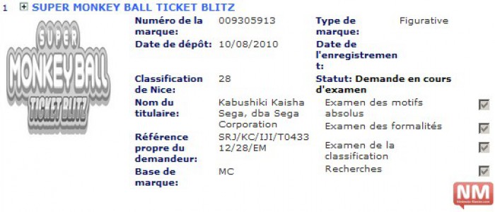 La firme au hérisson bleu serait-elle sur le point de nous révéler un nouvel épisode de la série Super Monkey Ball ? Nous savons que SEGA prépare actuellement un opus destiné à la future Nintendo 3DS mais nous n'avons pour le moment aucune information sur celui-ci. Cependant, en parcourant la banque de données des marques déposées en Europe, nous pouvons apercevoir que la firme a déposé le 10 août dernier le nom Super Monkey Ball Ticket Blitz.