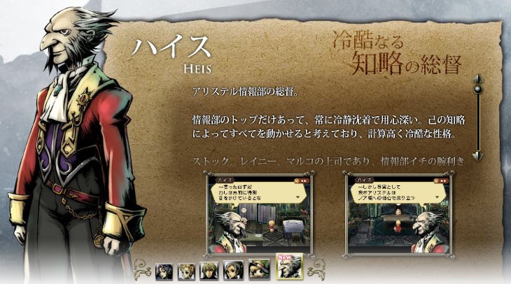 C’est grâce à une mise à jour du site officiel qu’Atlus a dévoilé un nouveau personnage de Radiant Historia, RPG à paraitre le 4 novembre prochain au Japon sur la console portable de Nintendo. Après la présentation du jeune héros et quelques-uns de ses compagnons, c’est maintenant au tour du froid et calculateur Heis d’apparaître sur les projecteurs. Chef de l’agence de renseignements d’Alicetel, ce vieil homme n’est ni plus ni moins que le supérieur hiérarchique de Stok et a placé sa confiance en lui pour défendre les intérêts de son pays. Dans un monde où conflits et mystérieuses épidémies menacent, nul doute que Heis devrait jouer un rôle important dans l’intrigue.