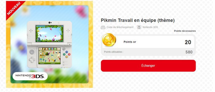 Pour fêter l'arrivée prochaine de Hey! Pikmin, le programme de fidélité My Nintendo accueille de nouvelles récompenses. D'abord les courts métrages Pikmin ; Pikmin Short Movies HD & Short Movies 3D respectivement pour Wii U et 3DS, au prix de 20 pièces d'or (pour chaque console). Pour rappel il s'agit de trois courts métrages supervisés par Miyamoto lui-même qui sont vendus par pack, soit en HD pour la Wii U soit en 3D pour la 3DS (voir ici pour les détails) Ensuite, il y a un nouveau thème pour menu 3DS nommé Pikmin - travail en équipe au prix de (là encore) 20 pièces d'or. Et pour finir, il est toujours possible contre 50 point Or d'avoir 20% sur le prix de Pikmin 3 (qui est déjà à 19,99€)afin de l'obtenir en version dématérialisée sur Wii U au prix de 15,99€ avec en prime trois packs de DLC "gratuits" ou plutôt à échanger contre 20 points Or