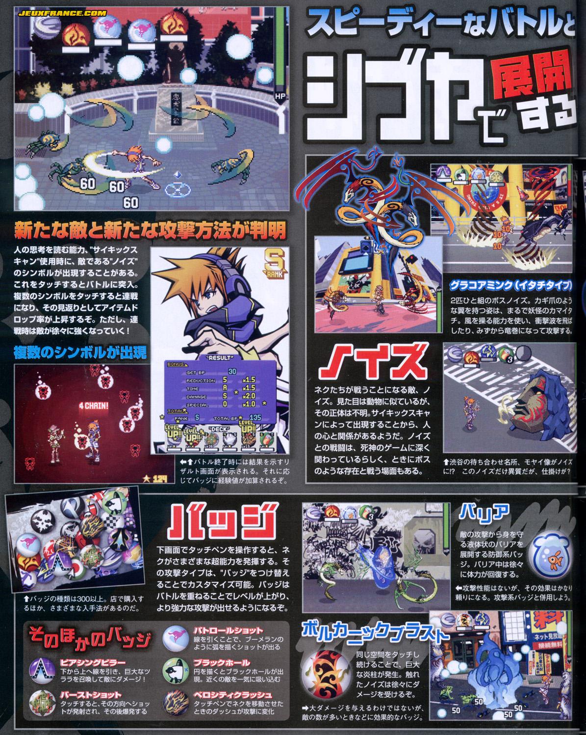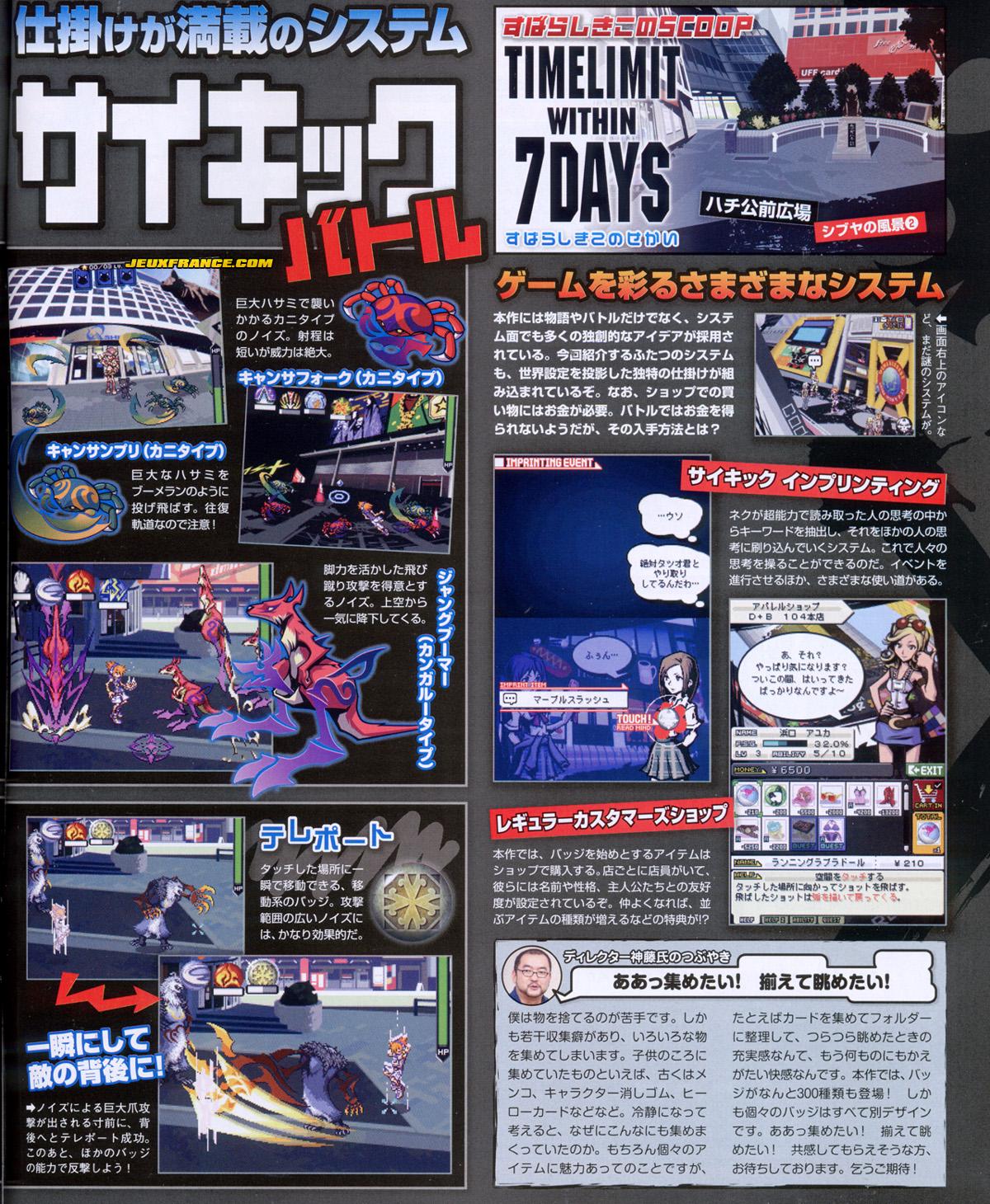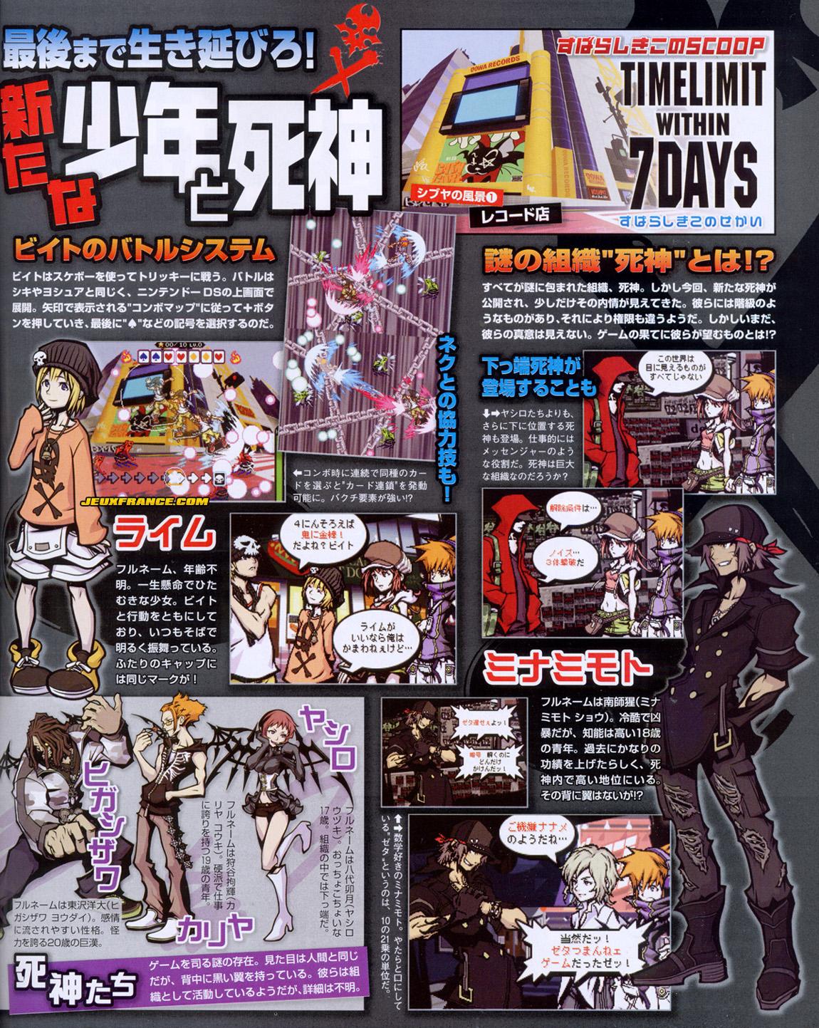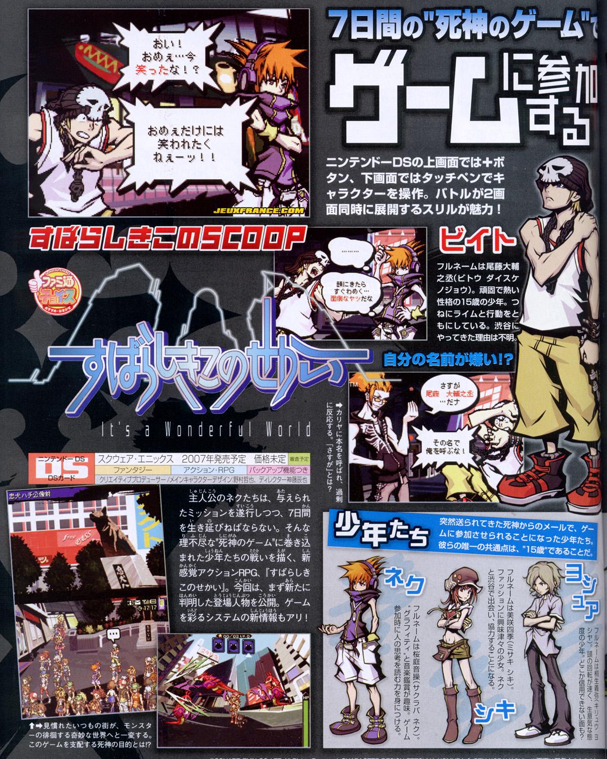 Voici quelques scans de It's A Wonderful World issus du dernier Famitsu ! ce qu'il faut savoir sur la dernière fantaisie (oh oui, il s'agit bien là d'un habile jeu de mot) de Square Enix, c'est que vous incarnez Neku Sakuraba dans un Shibuya futuriste et que vous devrez parcourir à des épreuves misant sur votre rapidité.