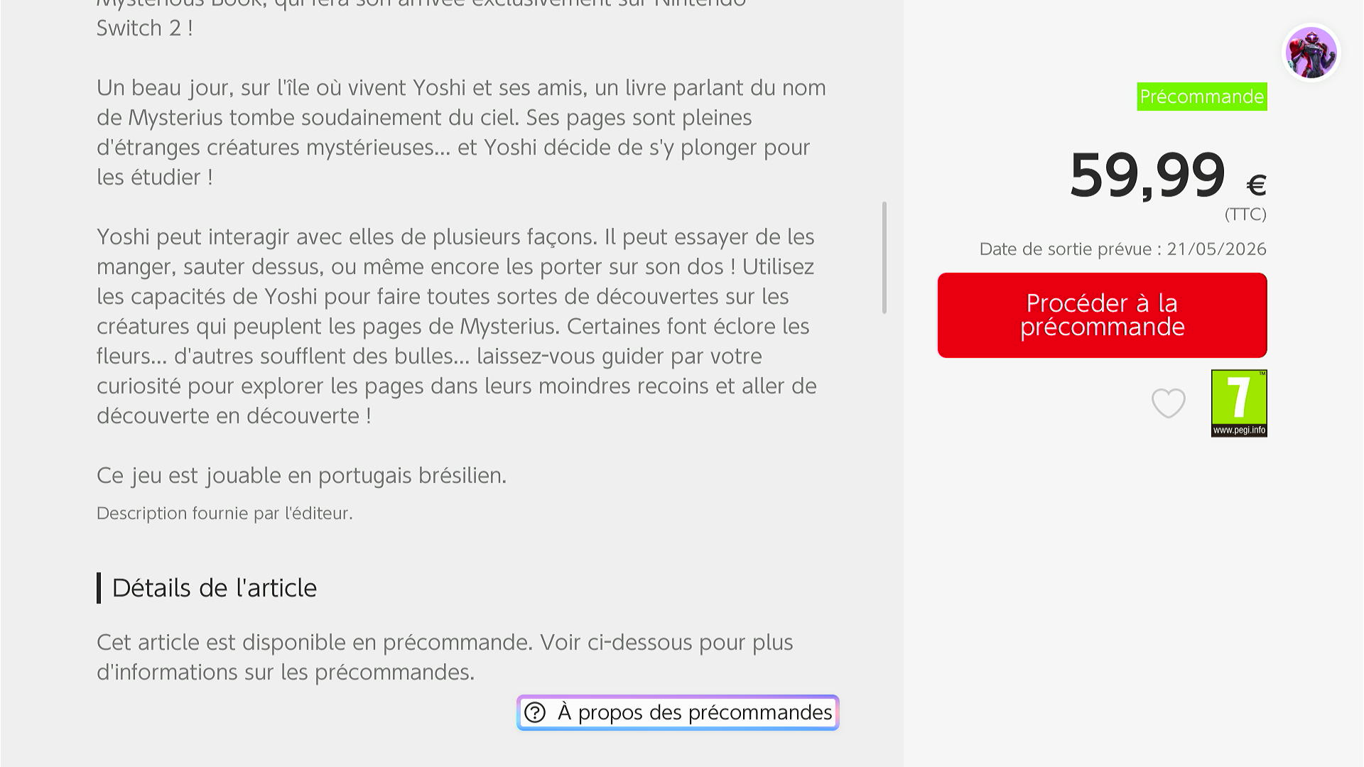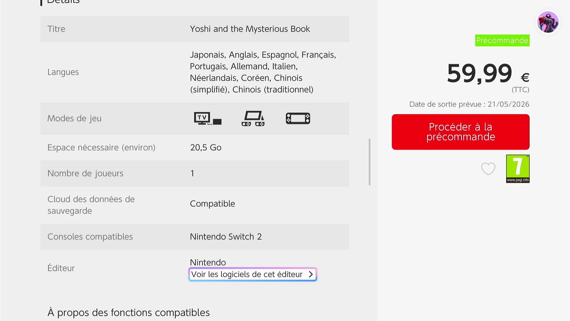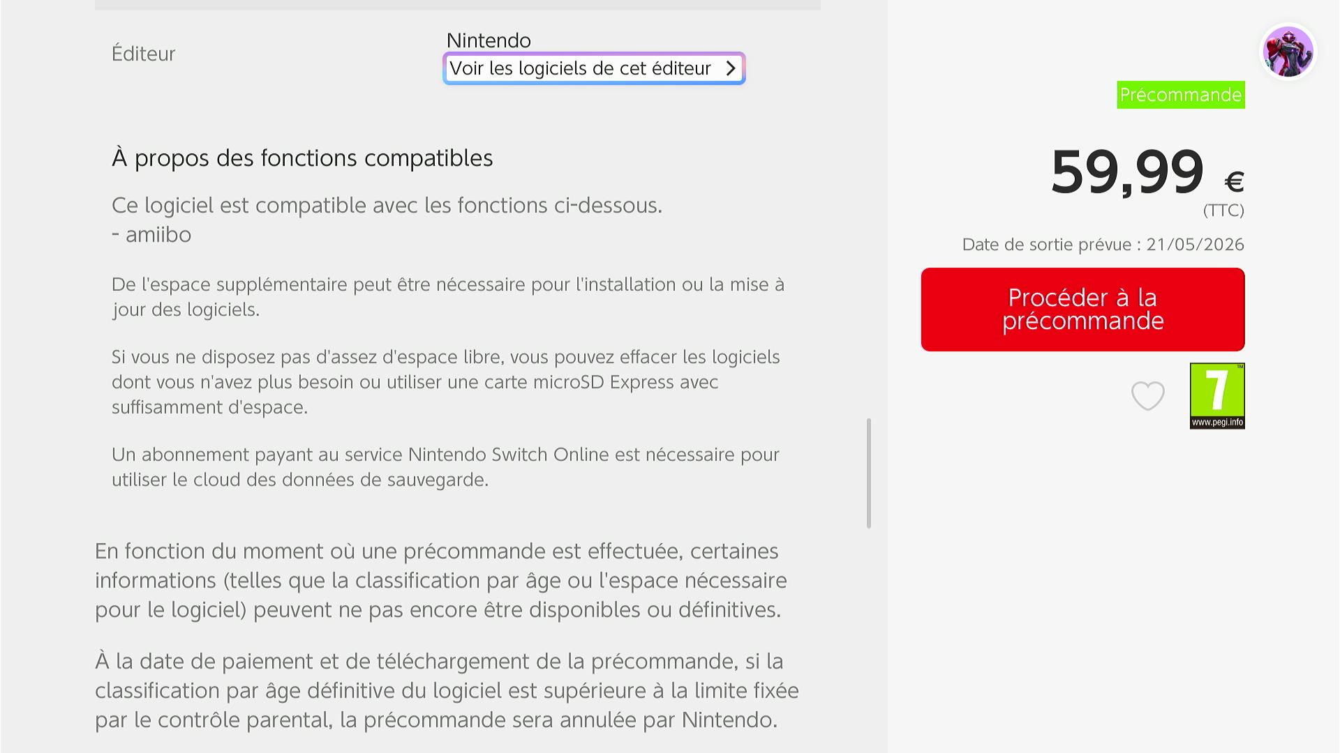 - Sur l'eShop, le jeu est annoncé au prix de 59,99€ pour un poids de 20,5 Go.